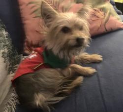 yorkierescuetexas@yahoo.com. Diego is ready for Christmas cuddles.