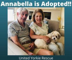 I/9/22 Annabella has been adopted and is already very comfortable in her new home! It was love at first sight between her and her new Mommy and Daddy. While usually a little shy when she meets new people, she responded to them right away during her Meet/Greet and even jumped onto her new Mommy's lap - something her foster Mom has never seen her do.